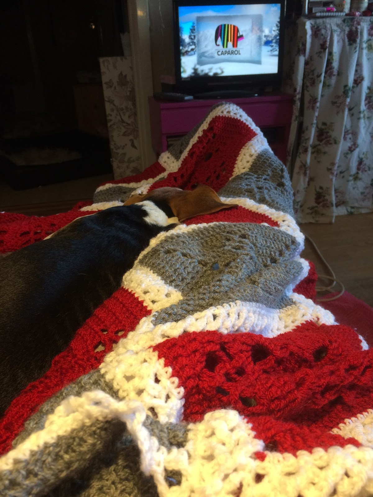 Dagens virkmål var att virka ihop en massa rutor till min julfilt. Jag brukar försöka att hålla hundarna borta från de virkprojekt som inte är klara eftersom jag inte vill virka in en massa hundhår, men i det här fallet har jag fått ge upp!